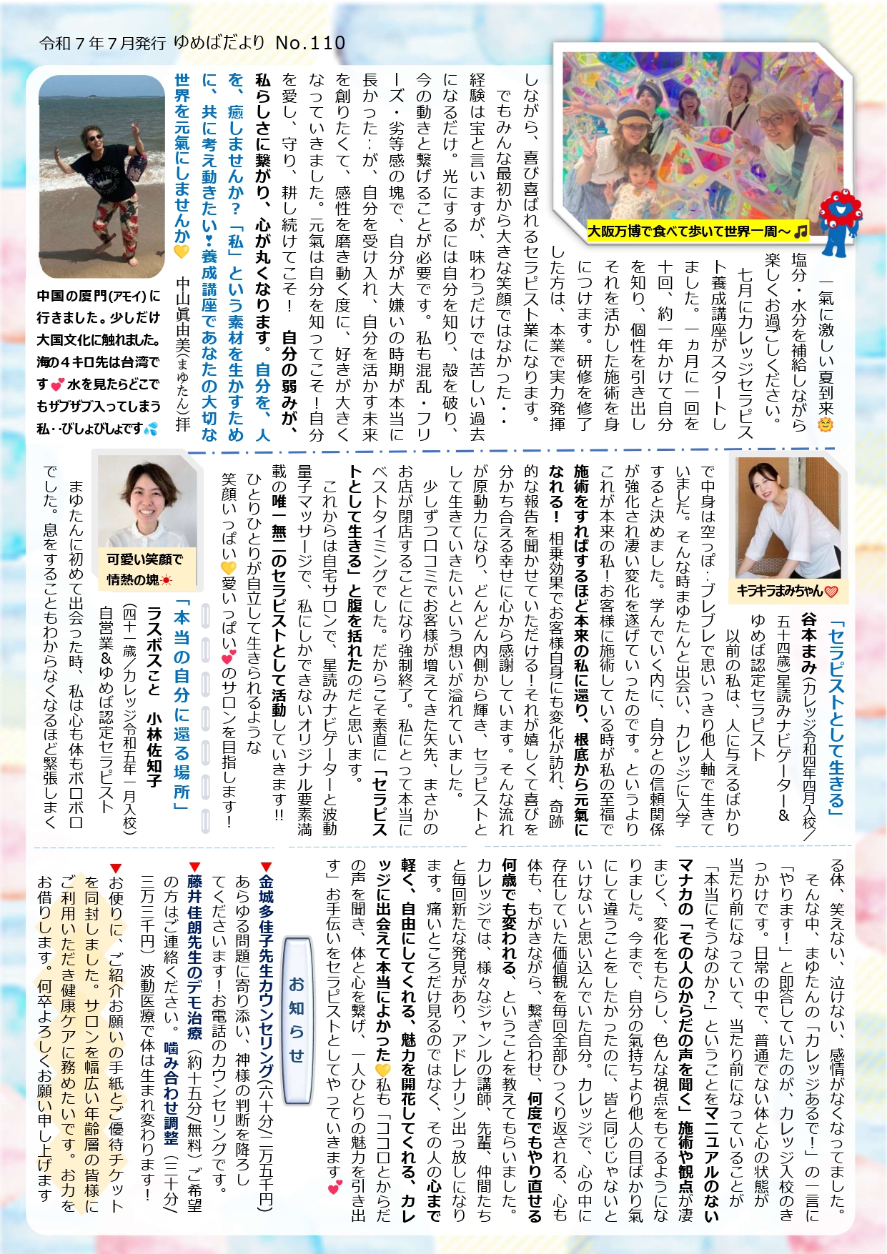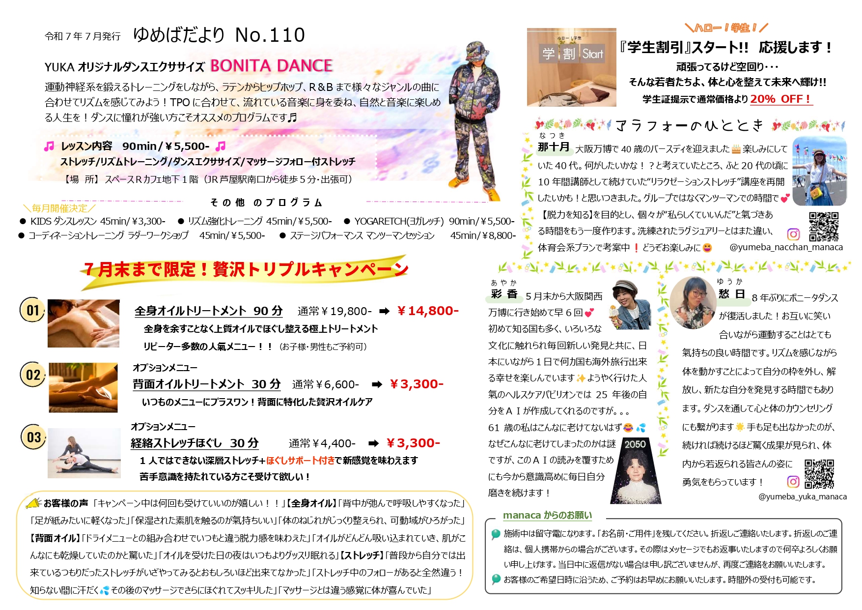 ゆめばだより110号 Posted on 2025年7月1日2025年9月5日 by manaca管理者 ゆめばだより110号を発行いたしました✨YUKAのBONITA DANCEがついに復活!!スタッフの近況はもちろん、大好評のトリプルキャンペーンや養成講座の情報を掲載しております!今回も盛り沢山な内容となっています。是非ご覧ください! PDF版はこちら PDF版はこちら PDF版はこちら